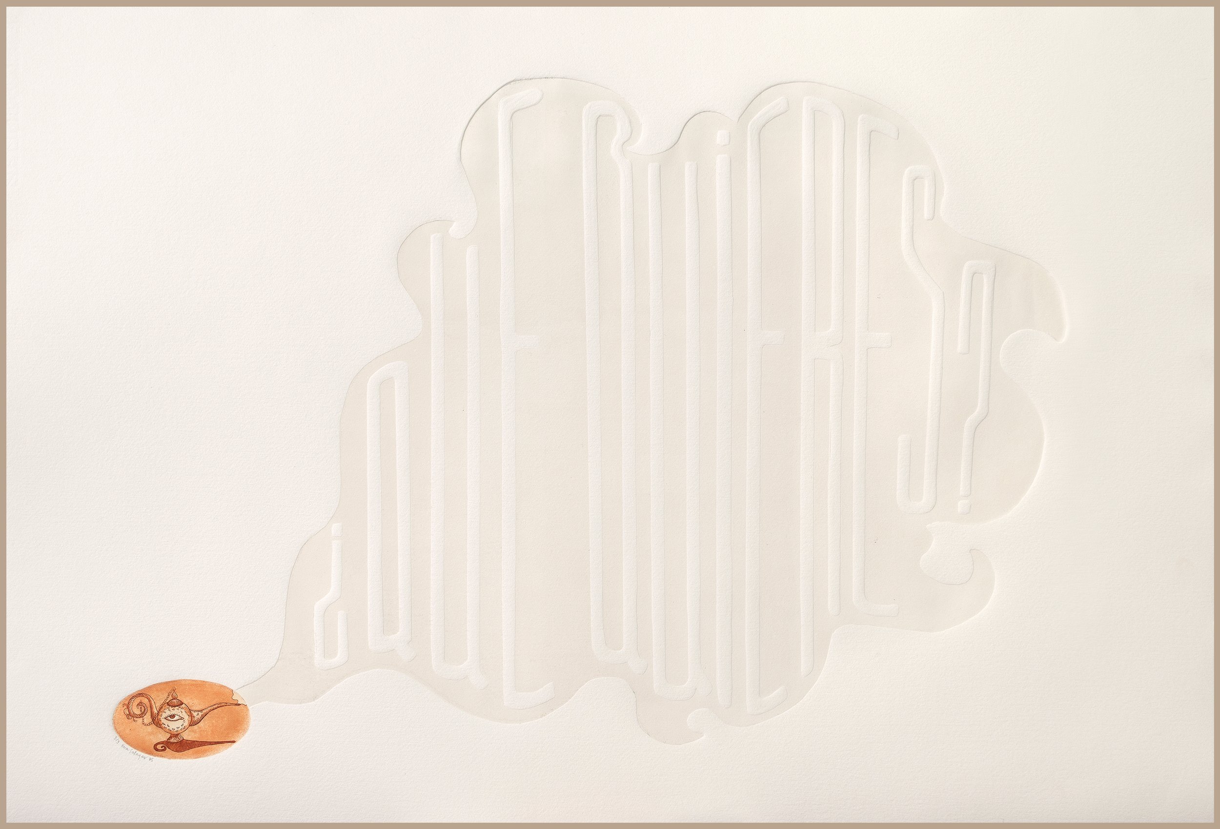 “¿Qué quieres?” grabado en aguafuerte, aguatinta y linóleo sobre papel algodón / 53 x 78 cms. / serie de 3