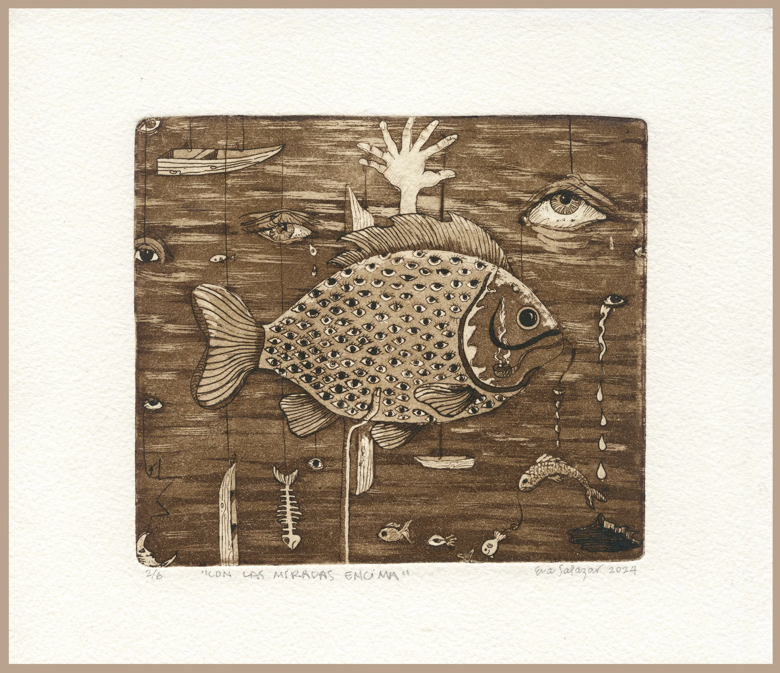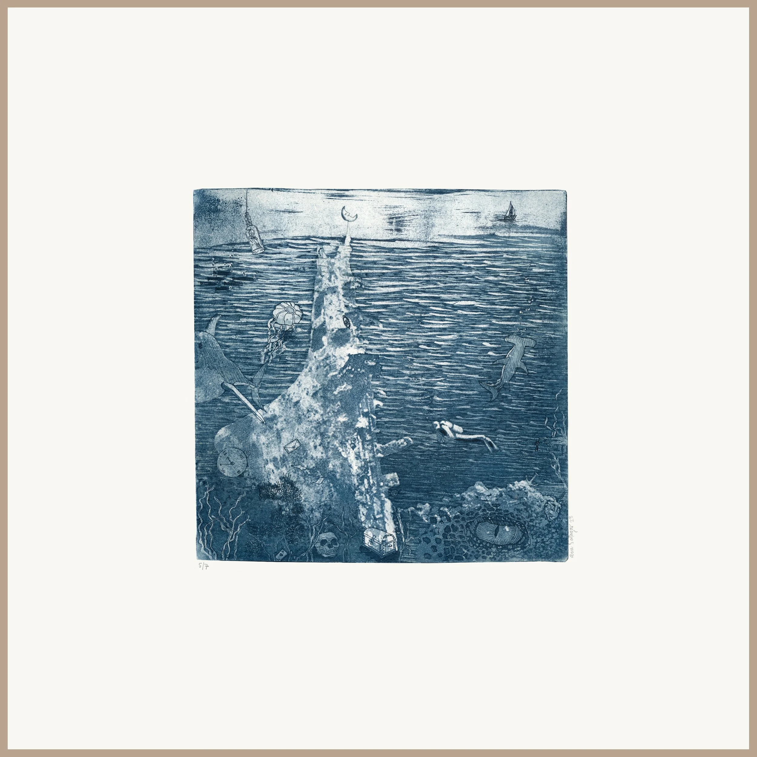 “Sumergirse no es solo un acto físico, es un descenso hacia lo que no se ve. Esta serie de grabados explora el agua no como superficie, sino como espejo del interior. Aquí, las profundidades marinas se funden con el inconsciente: un lugar donde la luz se disipa y las formas se vuelven fluidas, como en los sueños. Cada surco en la obra es un intento por capturar esa sensación de estar suspendido, donde el silencio del océano es, en realidad, nuestra propia voz interna resonando en la inmensidad.”